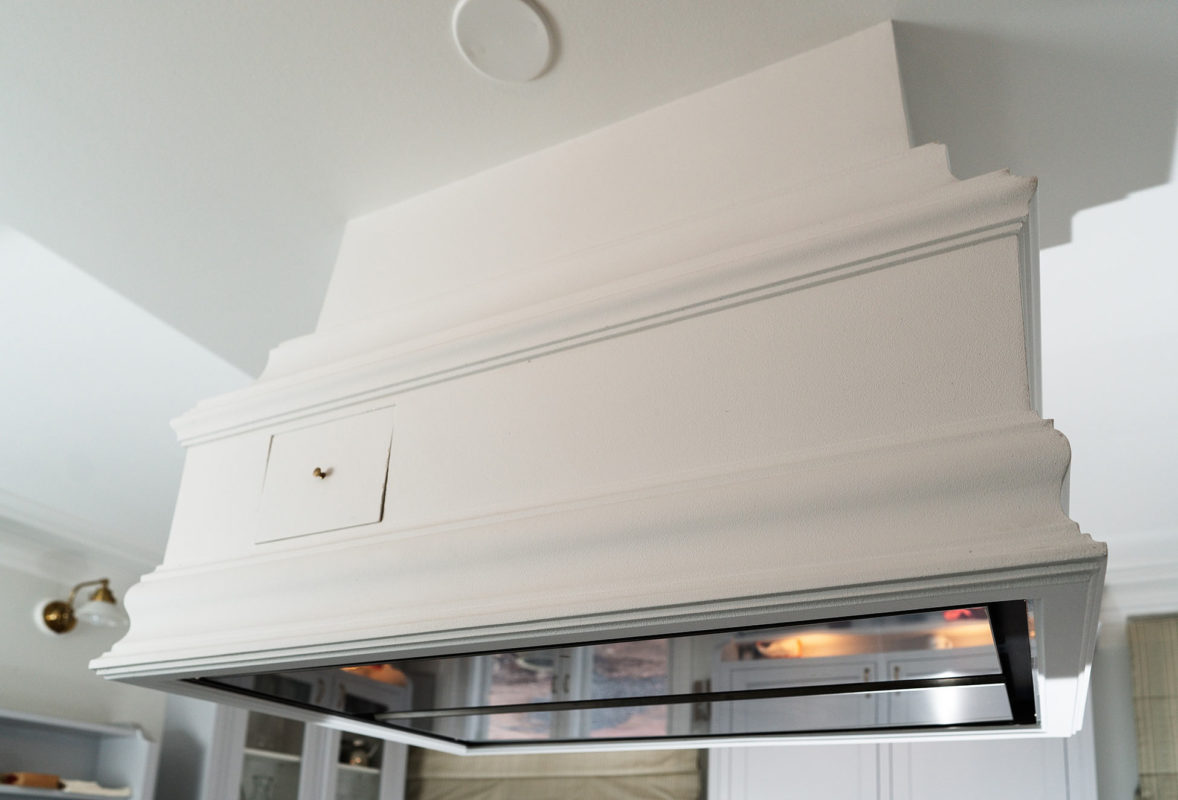 Mielenkiintoinen haaste: Liesituulettimen huuva tehtiin mittatilauksena. Saumojen minimoimiseksi huuva tehtiin kahdesta palasta.