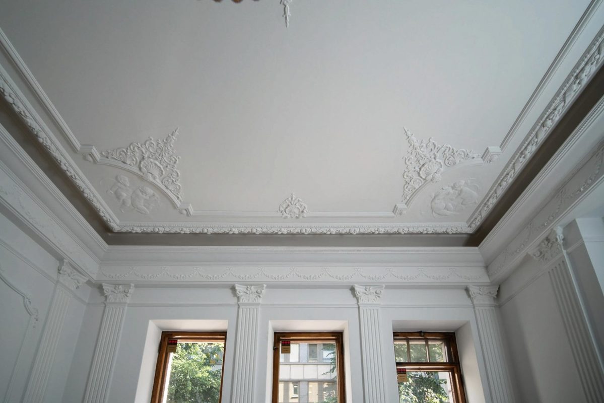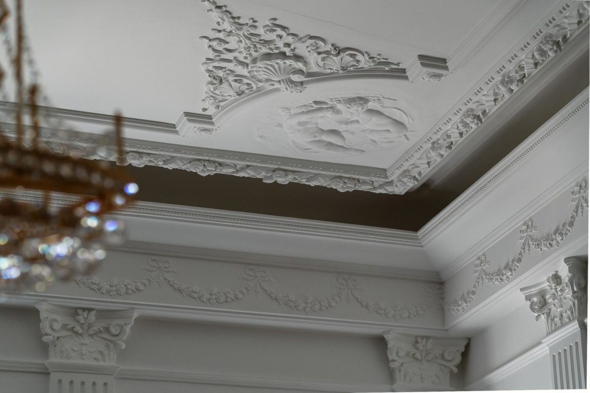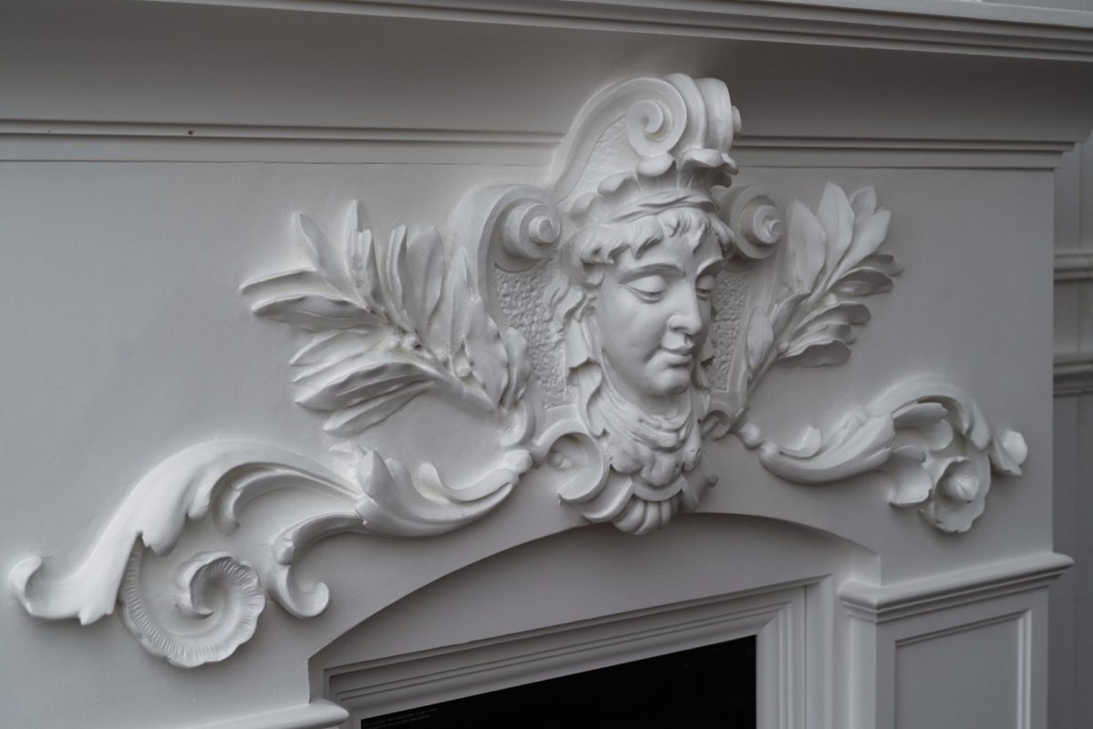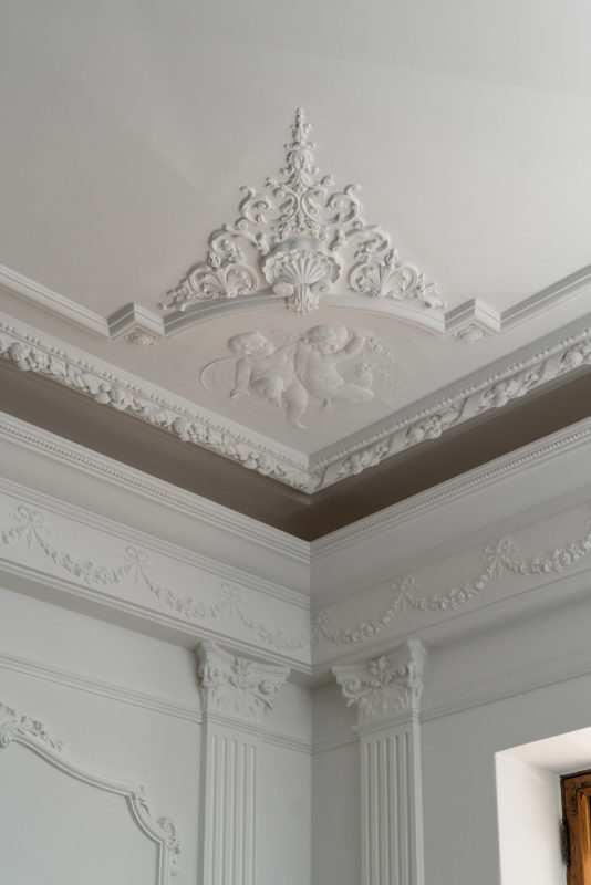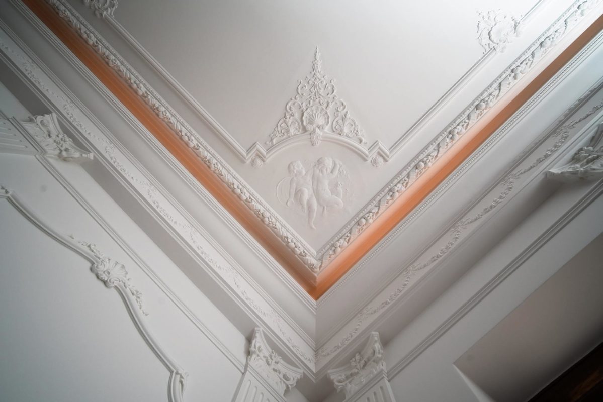 Mielenkiintoinen haaste: Huoneessa oli ainoastaan kaareva holkkalista, ei muita alkuperäisiä kipsikoristeita. Kipsi Helsinki valmisti kaikki uudet koristeet ja takan sekä teki asennukset ja maalaukset.