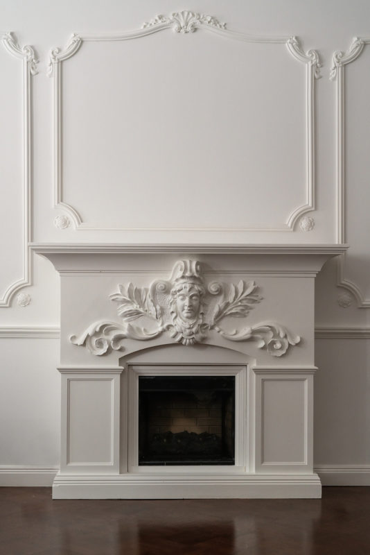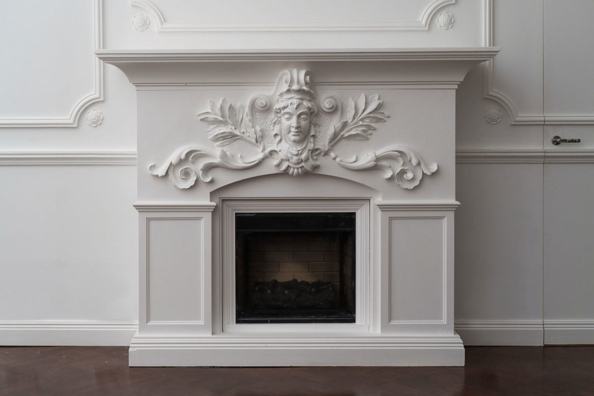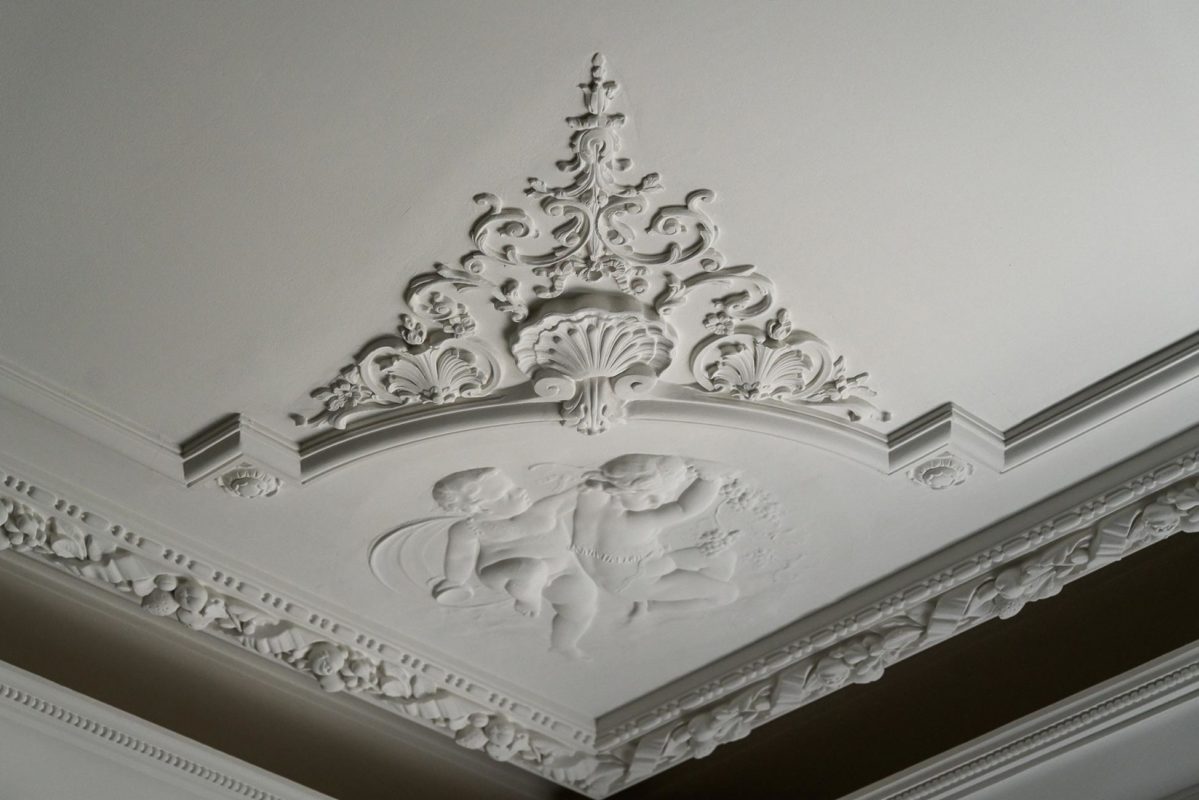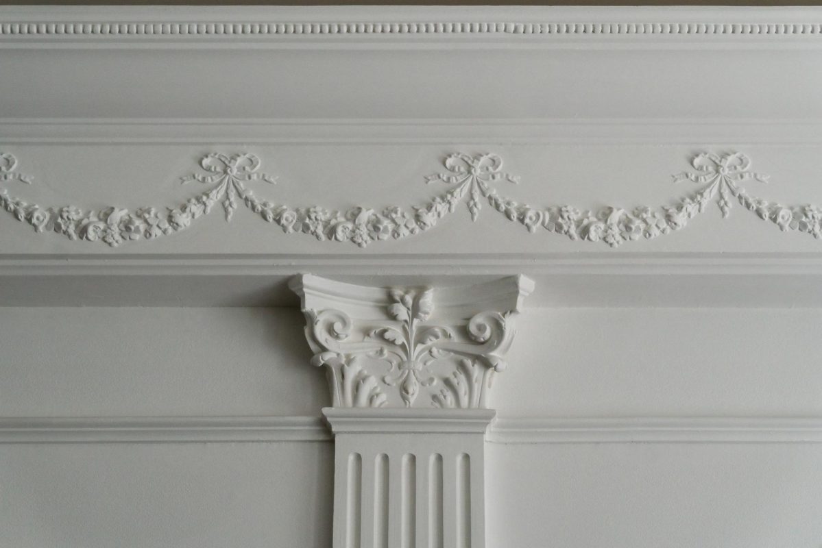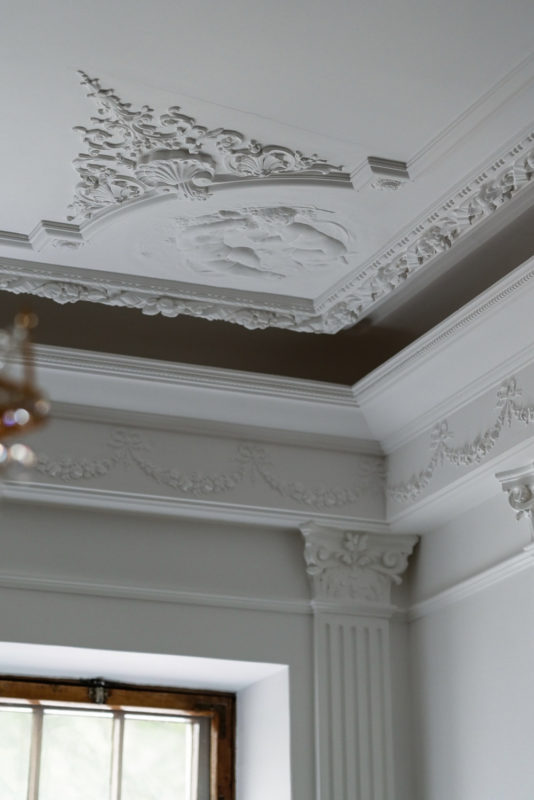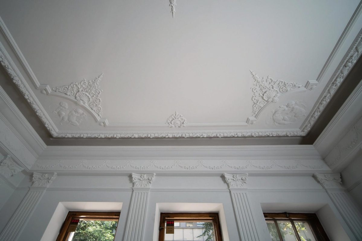 Mielenkiintoinen haaste: Huoneessa oli ainoastaan kaareva holkkalista, ei muita alkuperäisiä kipsikoristeita. Kipsi Helsinki valmisti kaikki uudet koristeet ja takan sekä teki asennukset ja maalaukset.