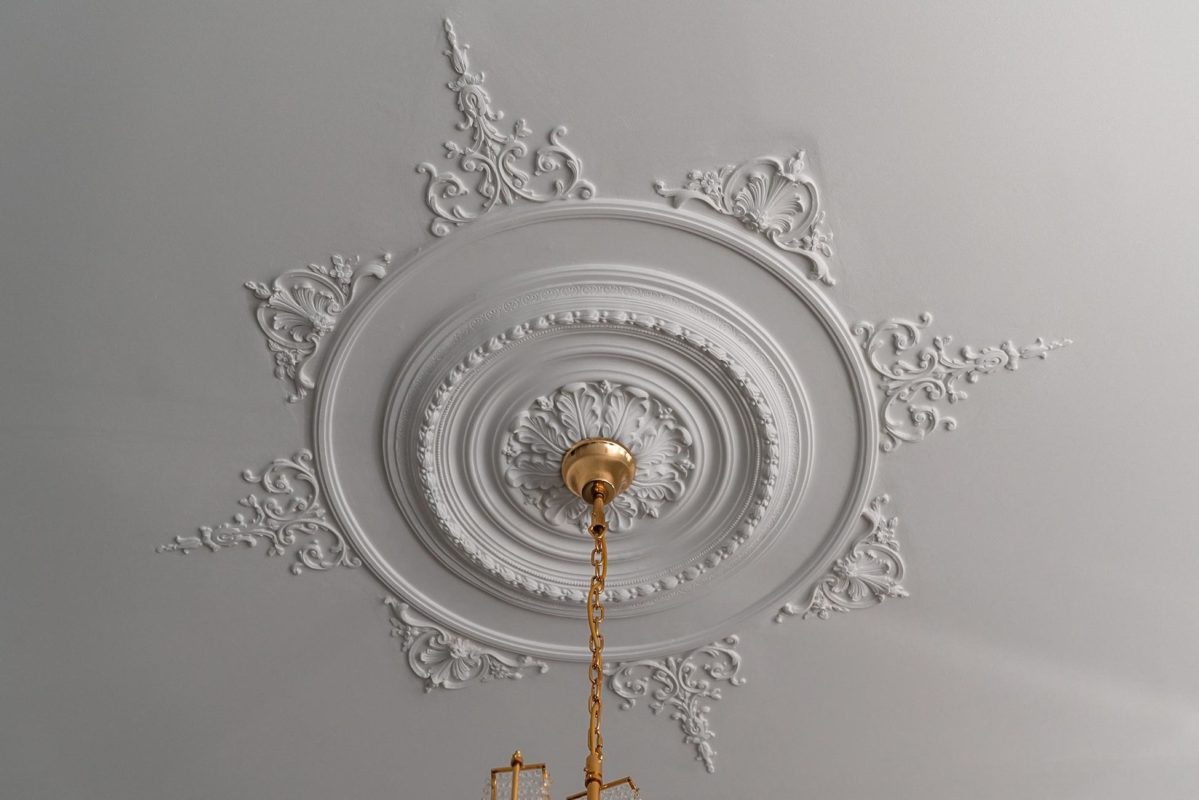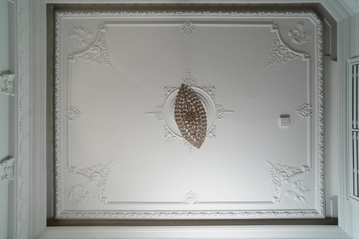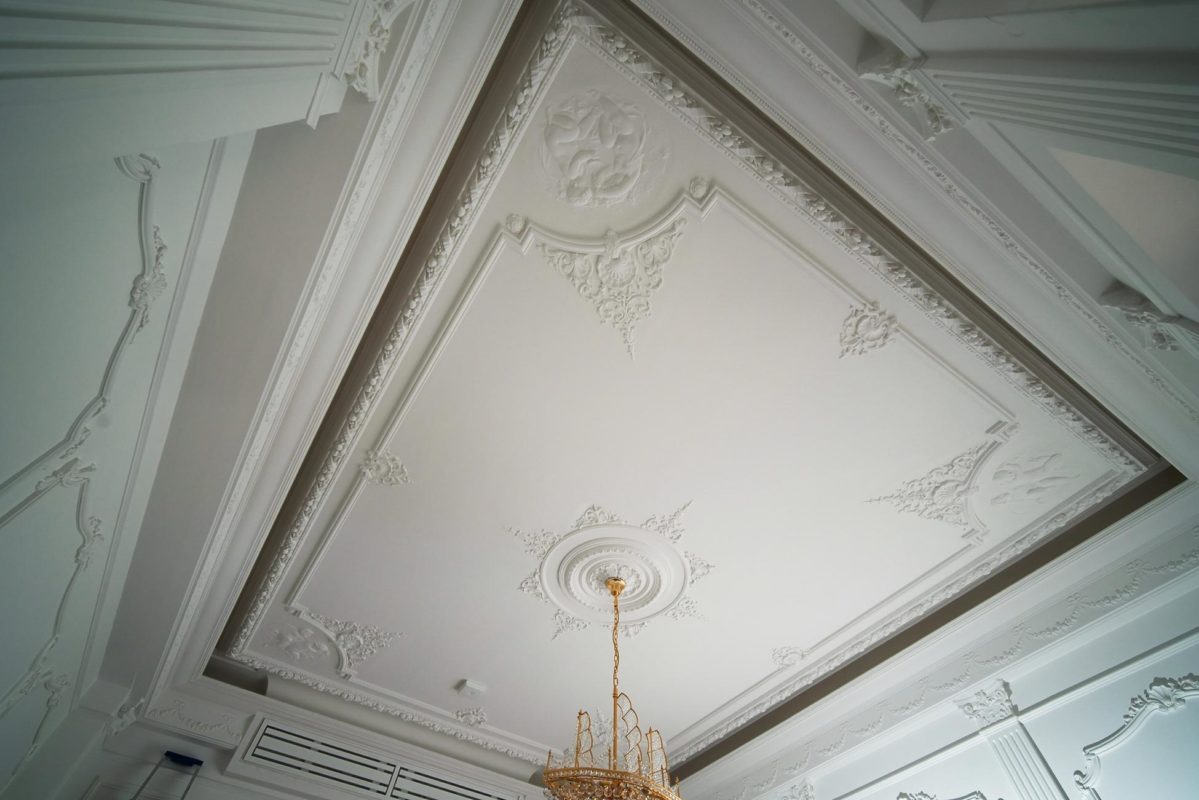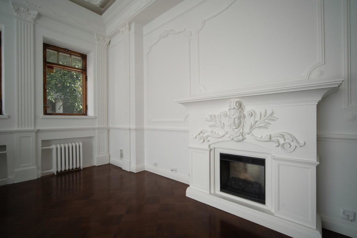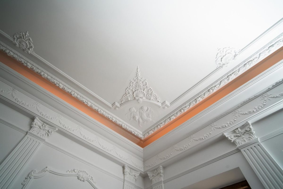 Mielenkiintoinen haaste: Huoneessa oli ainoastaan kaareva holkkalista, ei muita alkuperäisiä kipsikoristeita. Kipsi Helsinki valmisti kaikki uudet koristeet ja takan sekä teki asennukset ja maalaukset.