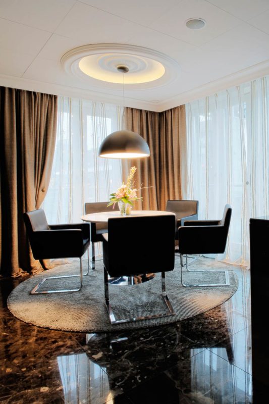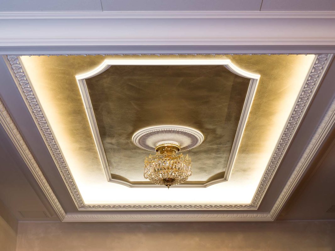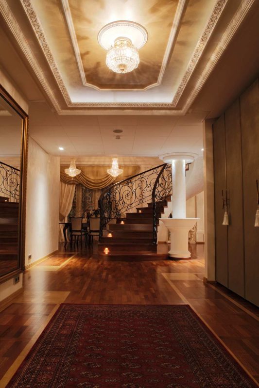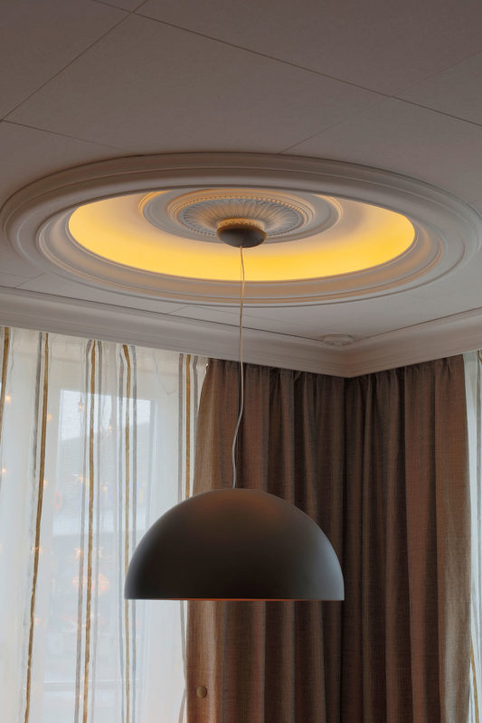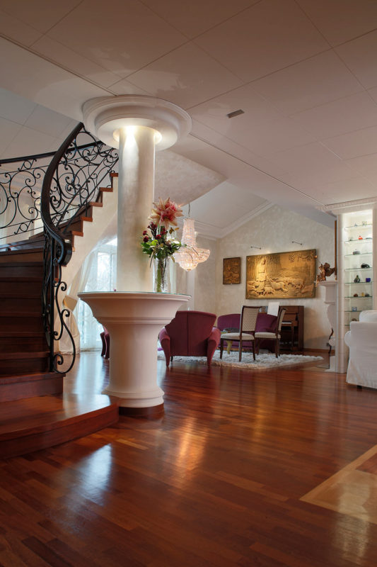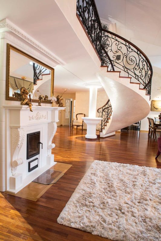 Vuonna 2012 valmistuneeseen uudiskohteeseen remontoitiin yrittäjäpariskunnalle kahden kerroksen huoneisto. Toteutimme ornamenttivalolistat, kattolistat, kattokupolin, kattorosetit, takan ja kantavan betonipilarin verhoilun.