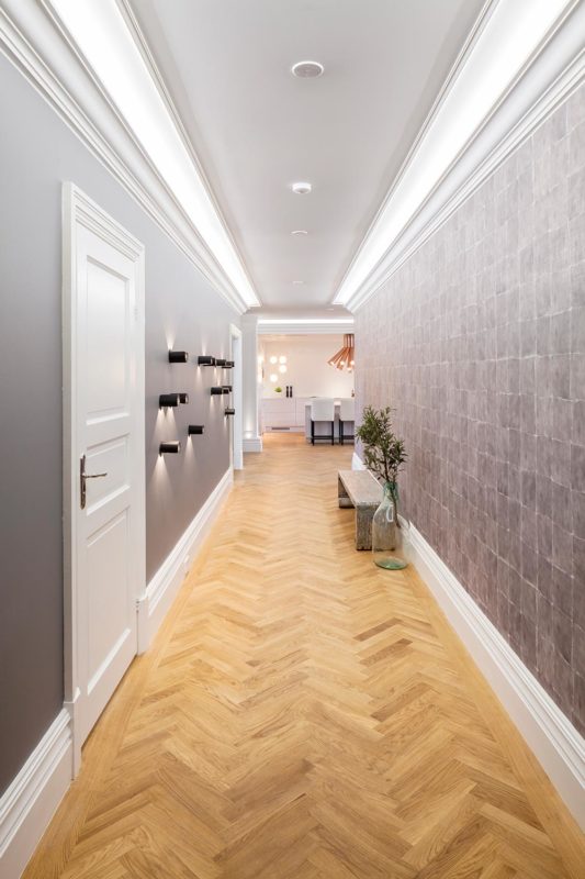 Bulevardilla sijaitsevaan kattohuoneistoon tehtiin valolistat, kattolistat, koristelistat, jalkalistat, ovilistat ja pilasterit.