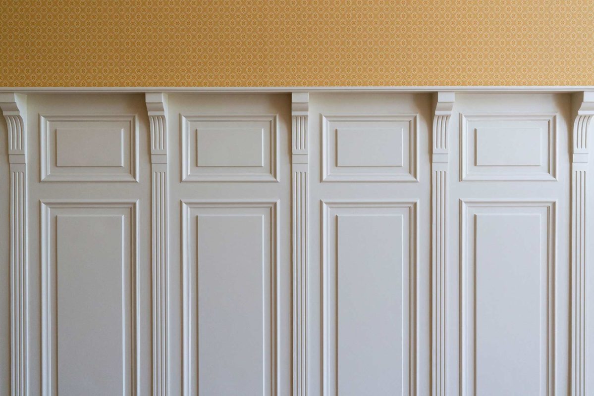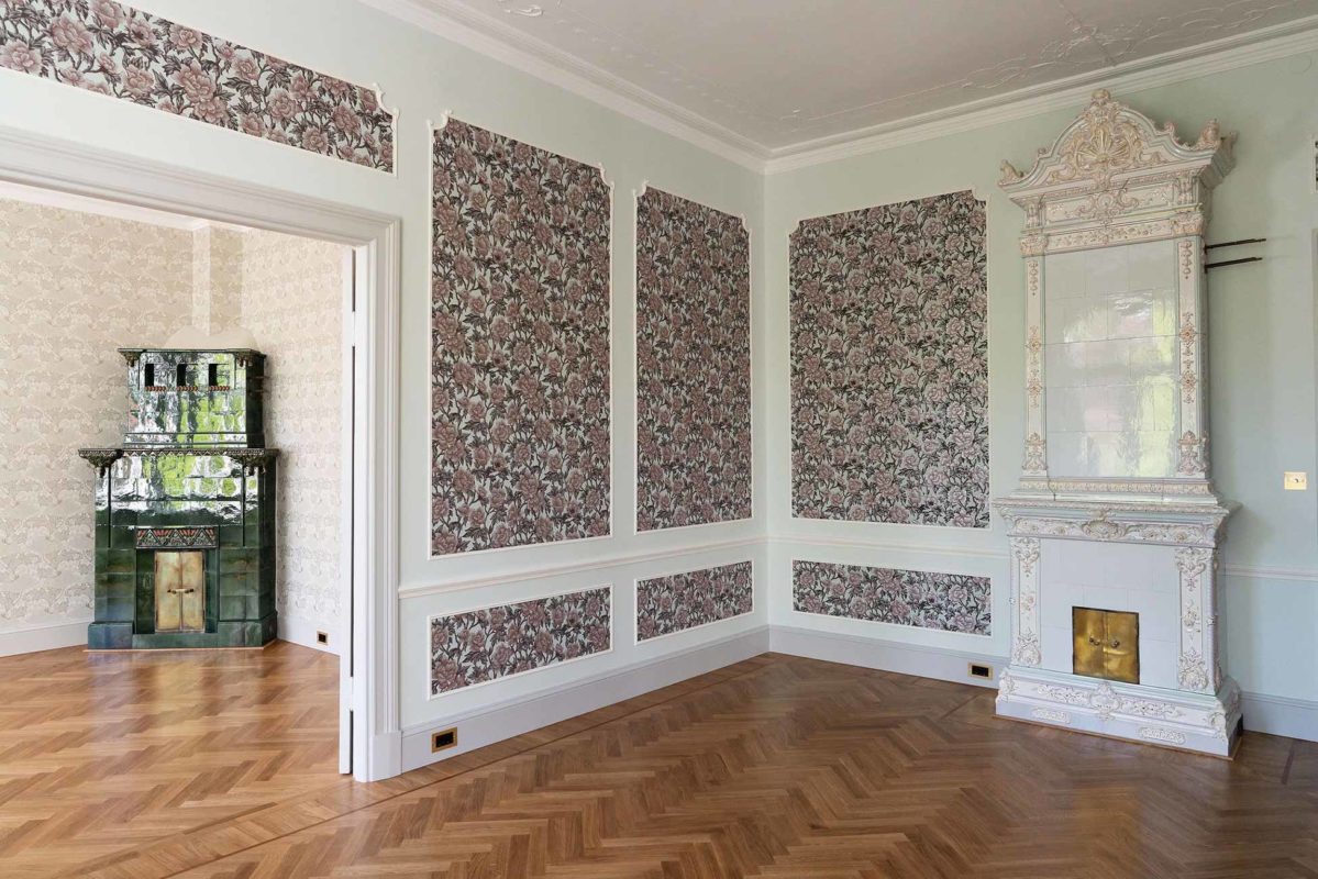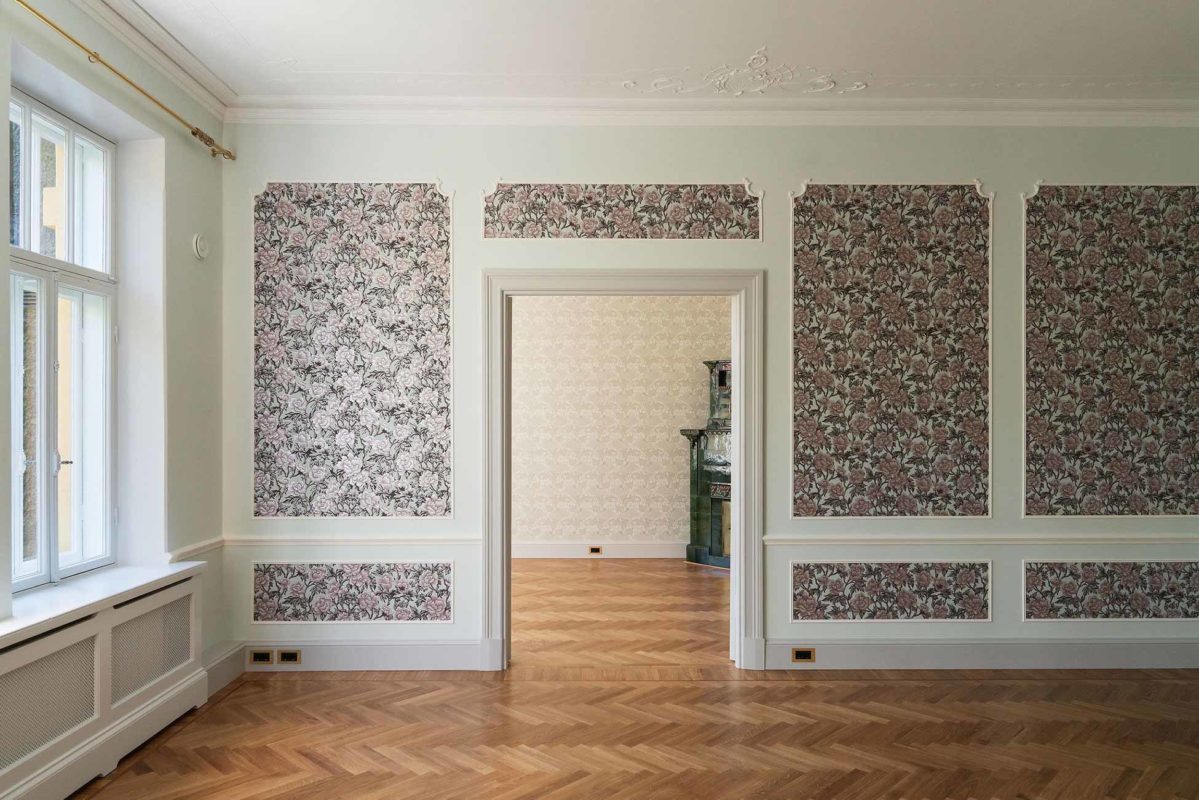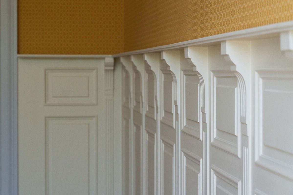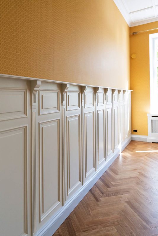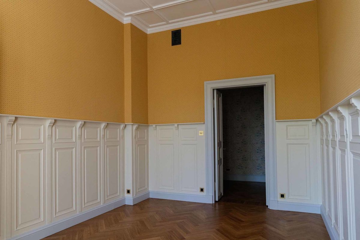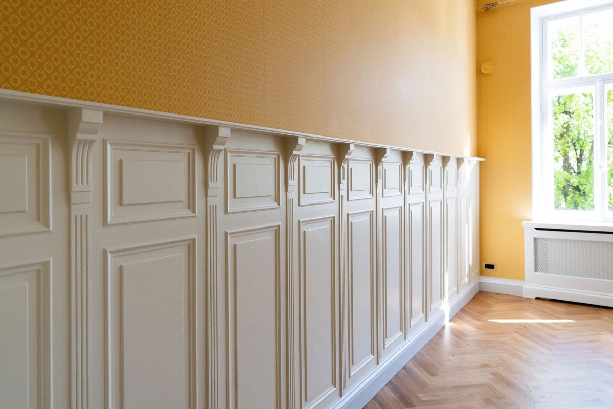 Tässä kohteessa tehtiin lähes kaikki mittatilauksena asiakkaan toiveita ja ohjeita noudattaen. Olohuoneeseen haluttiin saada alkuperäisien kattokoristeiden kanssa sopivat seinälistat. Saliin tehtiin kasettikatto koristelistoilla rakennuksen tyyliin sopivaksi ja seinille asiakas toivoi korkeaa paneelia ja konsoleita. Alkuperäiset lattia -ja ovilistat olivat puusta, mutta niistä haluttiin tehdä kookkaammat, joten ne skaalattiin isommiksi alkuperäistä muotoa noudattaen.