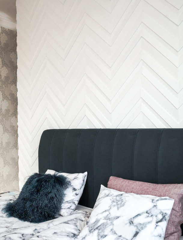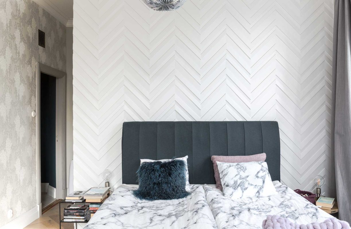 Mielenkiintoinen haaste: Päämakuuhuoneen seinä verhoiltiin kauttaaltaan kalanruotokuviolla ja sängynpääty upotettiin kipsiin.
