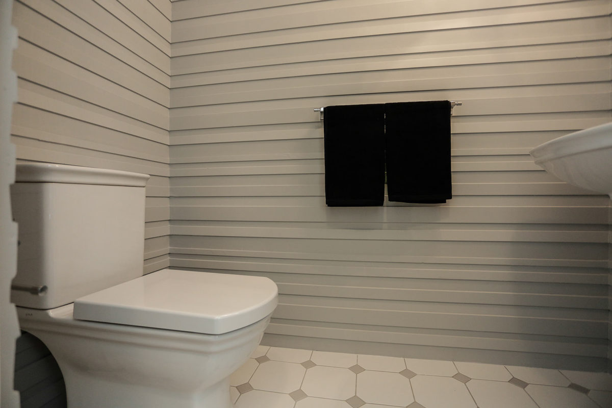 Mielenkiintoinen haaste: WC-tilan seinä verhoiltiin kauttaaltaan erikoiskovasta kipsistä valmistetuilla elementeillä.